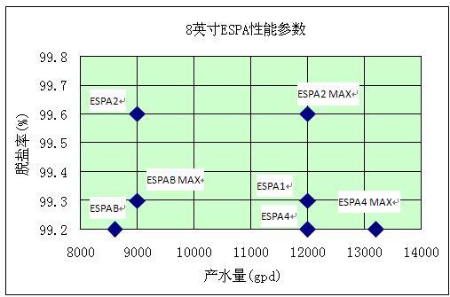 ESPA(Energy Saving Poly Amide)系列反渗透膜元件,是美国海德能公司于1995年5月在世界上率先推出的节能型超低压大通量复合反渗透膜。ESPA系列膜元件保持高脱盐率的同时具有更高的水通量特性,即在相同的产水量下,它的运行压力比传统低压反渗透膜运行压力低25-40%。ESPA系列膜元件的高水通量、高脱盐率的特征,使得设备制造成本和系统运行费用大为降低,并且节约了大量能源,进而使得反渗透系统更加容易推广并被认可。